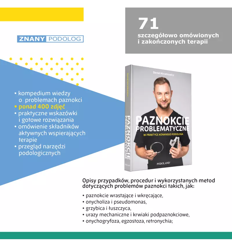 71 szczegółowo omówionych i zakończonych terapii. Opis przypadków, procedur i wykorzystanych metod dotyczących problemów paznokci.