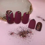 At first glance we see dirty burgundy, then fine black and red glitter. At the end there is a holographic black scale shimmering in various shades – from blue to green.