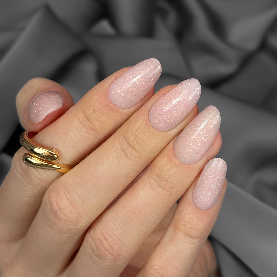 But that’s not all – Cute Ariel also delights with its multi-coloured particles, which are embedded in the structure of the gel. They shimmer like fairy dust in the rays of light, shimmering with shades of pink, copper, gold and subtle celadon. The effect they create is both delicate and noticeable – not exaggerated, but eye-catching. The particles beautifully reflect light, adding a noble shine and depth to the styling. This is a perfect choice for people who are looking for something more than classic nude – they want naturalness, but with a touch of uniqueness.