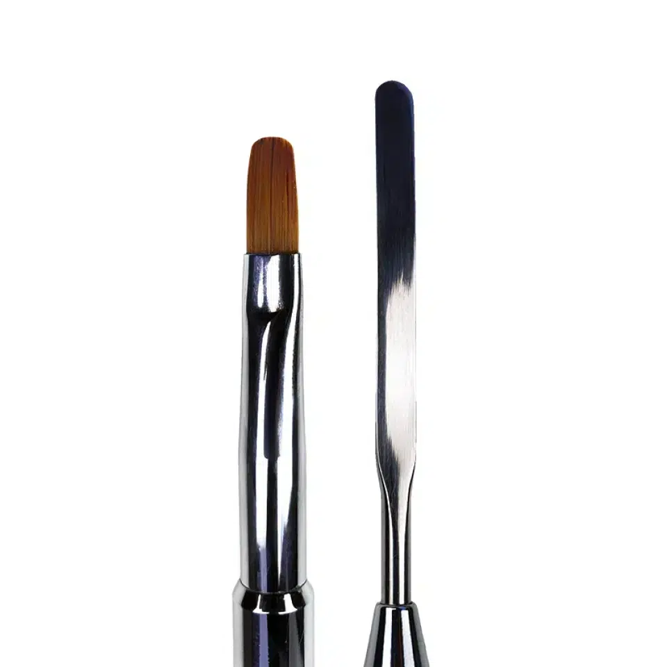 Don’t wait and check how the Premium Gel Master Brush 6 from Slowianka Nail Trends works. The Gel Master Brush 6 brush for applying acrylic nail polish is a tool with a comfortable metal spatula on one side and a flat brush made of a very dense mixture of flat synthetic and natural bristles on the other.