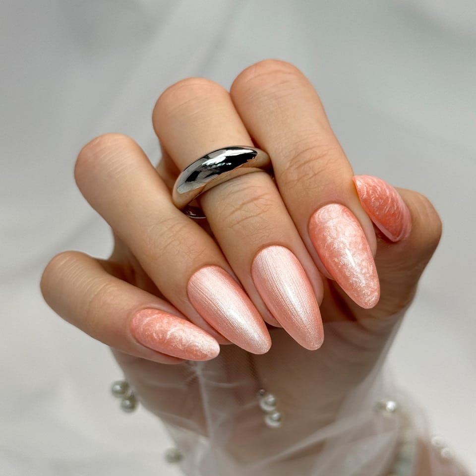 Color 492 Peach Glow by Slowianka Nail Trends is a peach shade with a shimmering pearl effect. The Pearl Paradise collection is an amazing novelty in this summer’s trends. These hybrid gel polishes are distinguished by a delicate, opalescent pearl effect, which can be used in various ways, creating different styles and final effects. Perfect for summer and holidays, but also for everyday use. The collection includes seven beautiful shades, from pastel pinks to neon yellows, blues and purples. The hybrid polishes have high pigmentation, cover in one layer, and their soft consistency makes application easier.