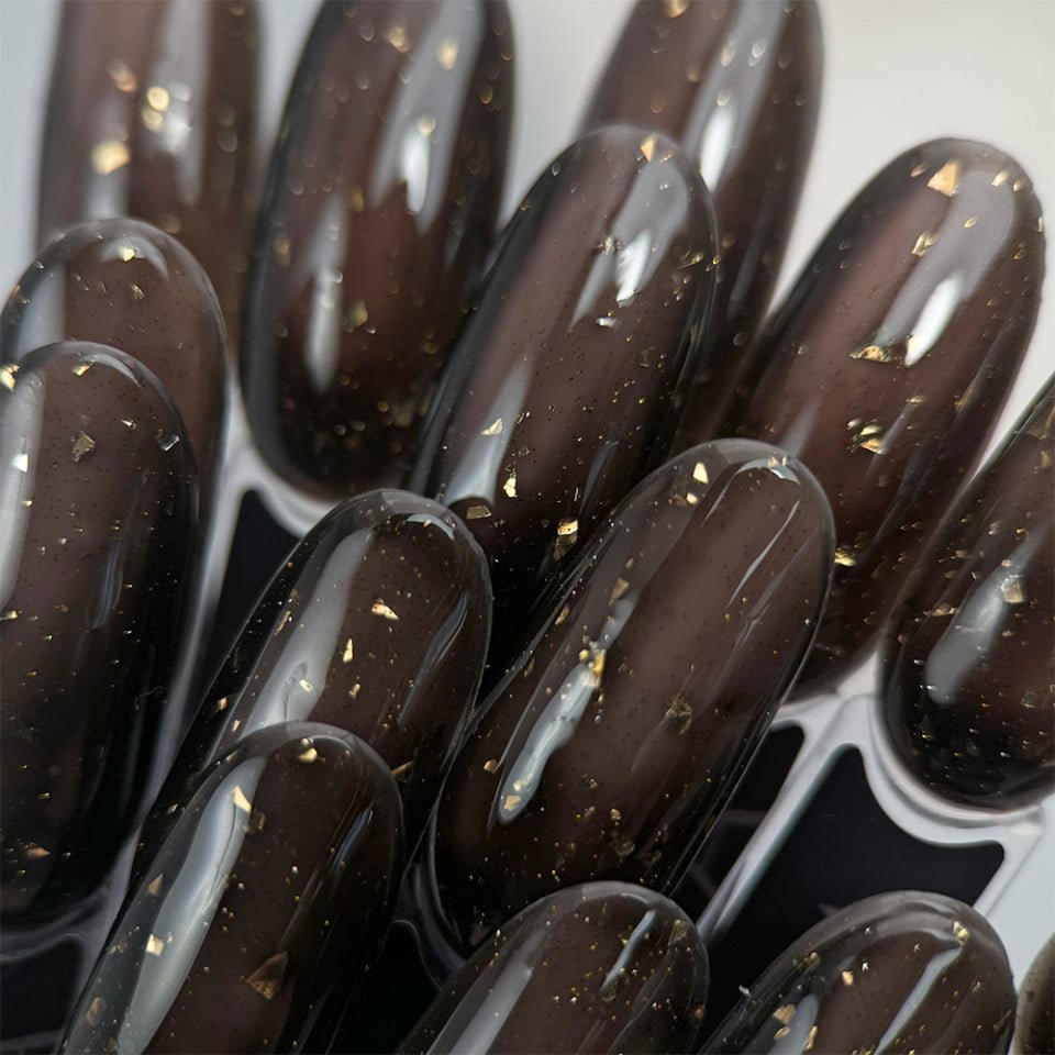 506 G old Flakes Fishnet from the Wild Vintage collection is a unique proposition, both in the offer of Slowianka and other brands. It is a semi-transparent black hybrid with the addition of flash dust in gold color, as well as metallic flakes, also in gold, creating an amazing effect together . A perfect choice for people who love the color gold! Ideal for autumn, adding character to natural nails !