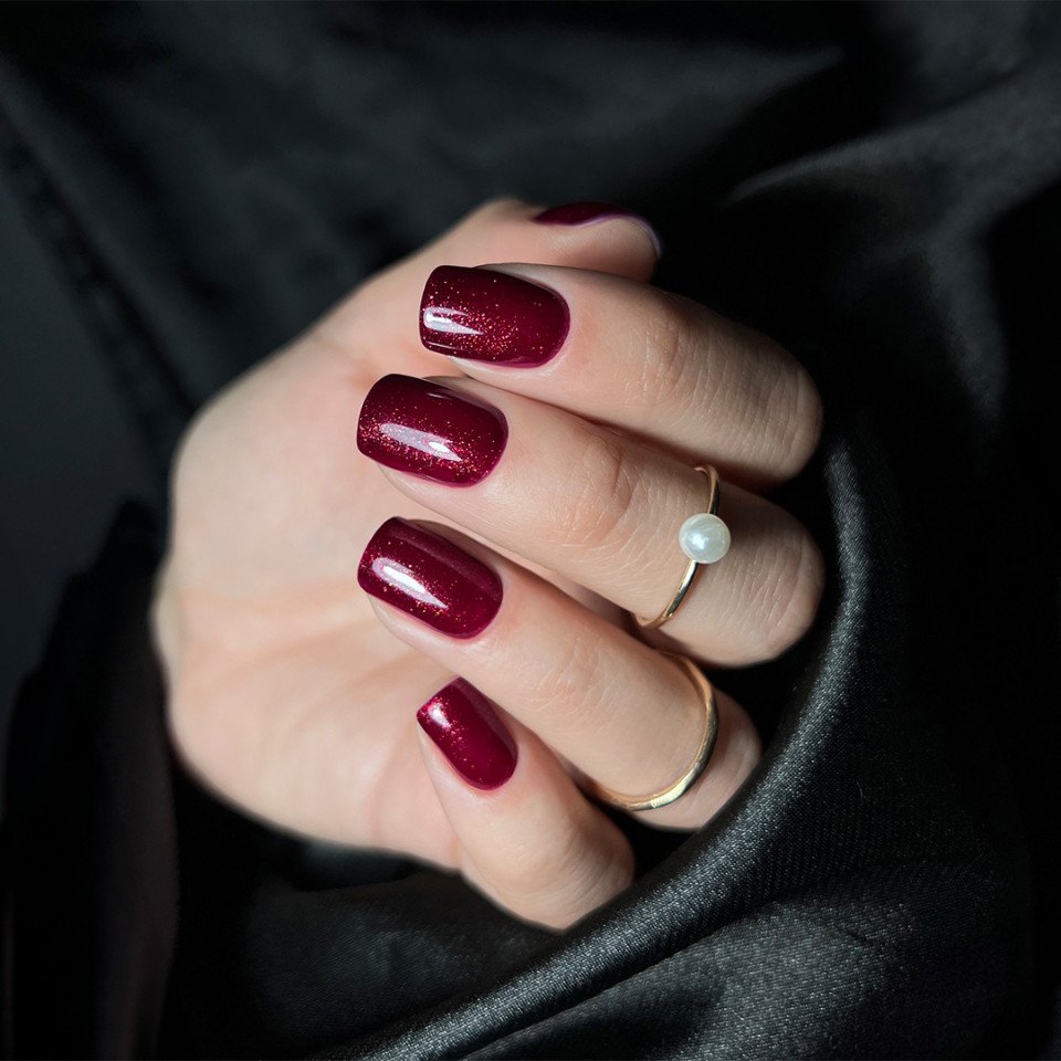 The Blissful color from the Heart Glow collection by Slowianka Nail Trends is a slightly lighter shade of red with a hint of burgundy, illuminated with a million shiny particles with a mermaid effect, which is a subtle, super feminine jewelry for the hands. The flickering and shining effect is extremely spectacular and allows you to shine in really good style. It perfectly complements all glamor stylings.