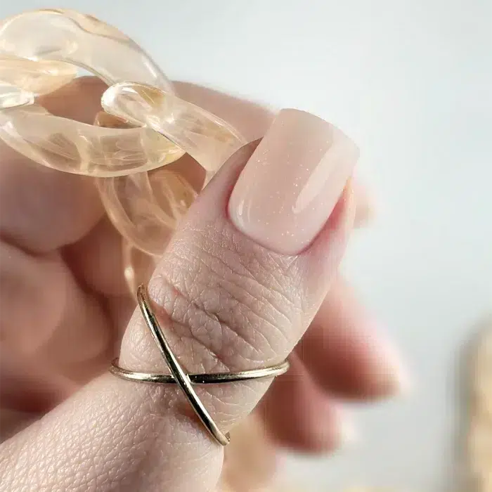 A very interesting, peach color in the Glitter Base Cover collection . However, it is not a typical, fresh peach, but a fleshy peach broken with beige. It contains medium-sized glitters that shimmer with gold when you move your hand, giving the impression of movement of particles in the base. The product is suitable for strengthening natural nails and their superstructure. Perfect for working with medium-hard and thin and brittle nails. Natural color with a delicate effect is a big plus of Peach Gold Base .