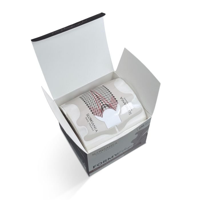 The new Slowianka nail extension forms are professional nail extension forms, designed for stylists who want to work faster, more precisely, and with even greater comfort. When designing this new generation of nail forms, we took into account the experience of stylists and the most frequently reported needs of salon and training work. This resulted in professional nail forms that facilitate nail development with gel, acrylic gel, and other styling products. Our nail form forms are ideal for extending nails to various lengths and shapes, such as square, oval, almond, or stiletto. The reinforced adhesive used ensures stability during work – the form holds even at high temperatures and does not peel off during curing in the lamp. At the same time, the forms maintain the perfect balance between flexibility and stiffness. Thanks to the special double foiling, they maintain their shape, do not bend, and allow for the creation of a perfect nail tunnel without bends or irregularities. This is especially important for stylists who want to create perfect nail architecture. The forms have a soft, beige color, which makes it easier to control work with light, dark, and transparent products. Double length markings – located both in the center of the form and on the sides – further simplify the process. This allows the stylist to more quickly control the length and side lines of the nail. The top of the form is pre-cut, speeding up application and eliminating the need for tearing. Intuitive graphics and guide lines for cutting the sides and smile line help perfectly align the form with the natural nail plate. The forms are available in rolls of 500 and in packs of 250 (individually cut). They come in two lengths: Long – for longer forms and extreme shapes; Short – for shorter styles, especially short almond shapes. Slowianka professional nail extension forms are a tool created for stylists who expect the highest quality work, perfect nail architecture, and maximum comfort during styling.
