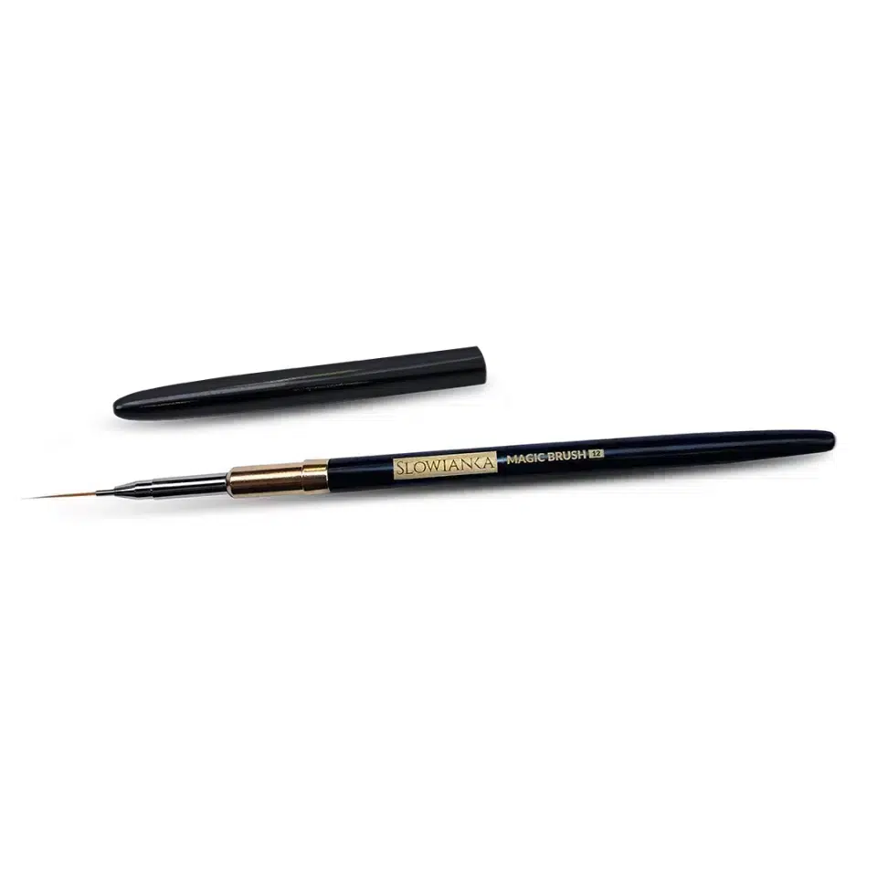 The elegant 12mm magic nail art brush is a professional manicure tool for painting decorative compositions. The nail brush is made of synthetic bristles with a length of 12 mm. A manicure brush is perfect for painting long, continuous lines. A thin brush ideal for long elements, lines, Sharm Effect decorations and gel feathering.