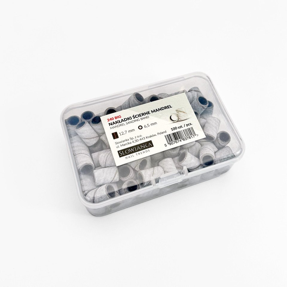 Large carrier overlays from Slowianka Nail Trends with a grit of 240. Disposable overlays in the shape of a file in a cylinder, most often used for filing the natural nail before extension with a base and hybrid manicure, but also for filing the entire artificial nail. One of the best products for the nail filing method. A white overlay with a sand coating that is very tight and adheres to the paper as much as possible and does not fall off when sawing. It has sharp edges, allowing file even hard-to-reach places. It is not too thick due to the gluing of strong but thin paper. This overlay combines perfectly with the large mandrel carrier.