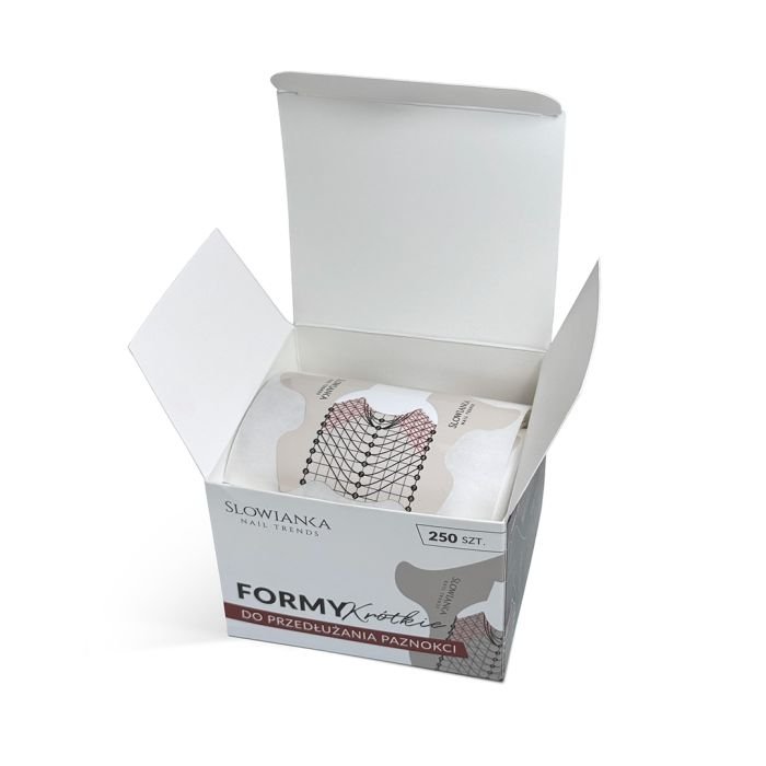 Short Slowianka Paper Forms – 250 pcs per box are professional nail extension templates designed for shorter salon nail designs. Their stable construction and strong adhesive ensure a secure fit and comfortable work during nail development. The bright surface with clear guide lines makes it easy to control the length and symmetry of the design. The templates are pre-cut and ready to use, and the practical box protects them during storage.