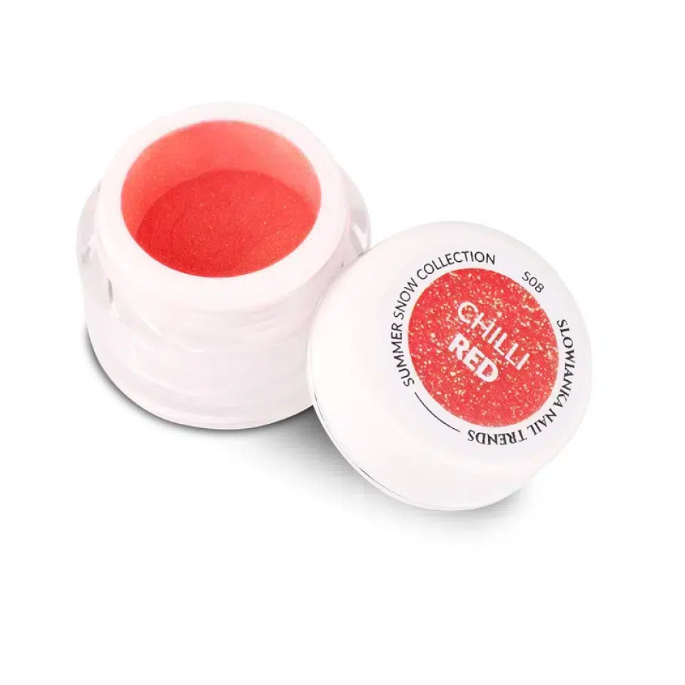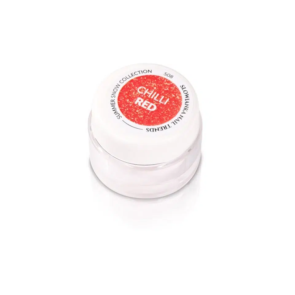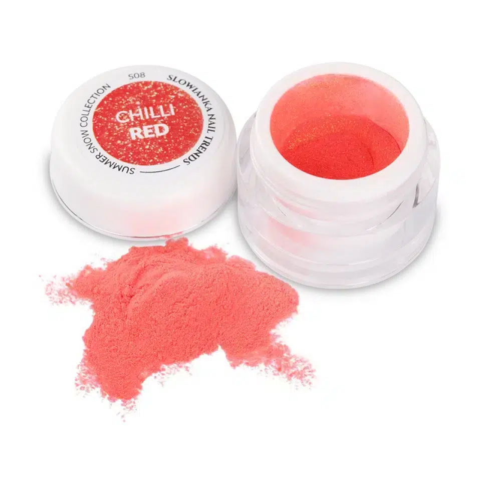 3D dust, glitter powder, hybrid powder – Summer Snow Chilli Red Slowianka Nail Trends powder has many names in manicure salons. This is one of the accessories for decorating hybrids, which allows you to quickly obtain original and interesting decorations. It is in the form of a rough powder that gives the nails a frosty effect. Combined with juicy, strong, neon colors, they resemble the surface of fruit sorbets.