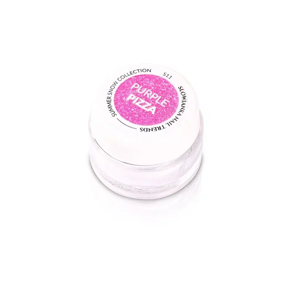 3D dust, glitter powder, hybrid powder. Summer Snow Purple Pizza Slowianka Nail Trends powder is one of those nail accessories that easily allows you to achieve original and interesting decorations. What makes it stand out is the intensity of the neon color combined with a fabulous, icy shine that sparkles with particles.