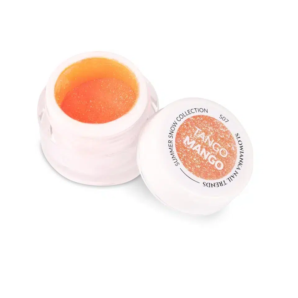 Summer Snow Tango Mango Slowianka Trend Nails powder is a revolutionary way to create a hybrid manicure. The entire Summer Snow line includes nail art accessories in the form of rough powders. Some nail stylists also call them 3D dust or glitter powder. It can be applied to a wet hybrid in three ways. You can do it on uncured varnish, you can apply it twice or get a gloss effect. It is created after the product has been polished. It is then exceptionally expressive. All Summer Snow powders have neon colors. The “snow” effect is created by powder particles. They sparkle like frost. They somewhat resemble fruit ice cream.