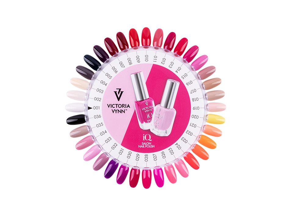 Ready, round sample of classic iQ Nail Polish nail polishes. Presents 36 colors (001 – 036).